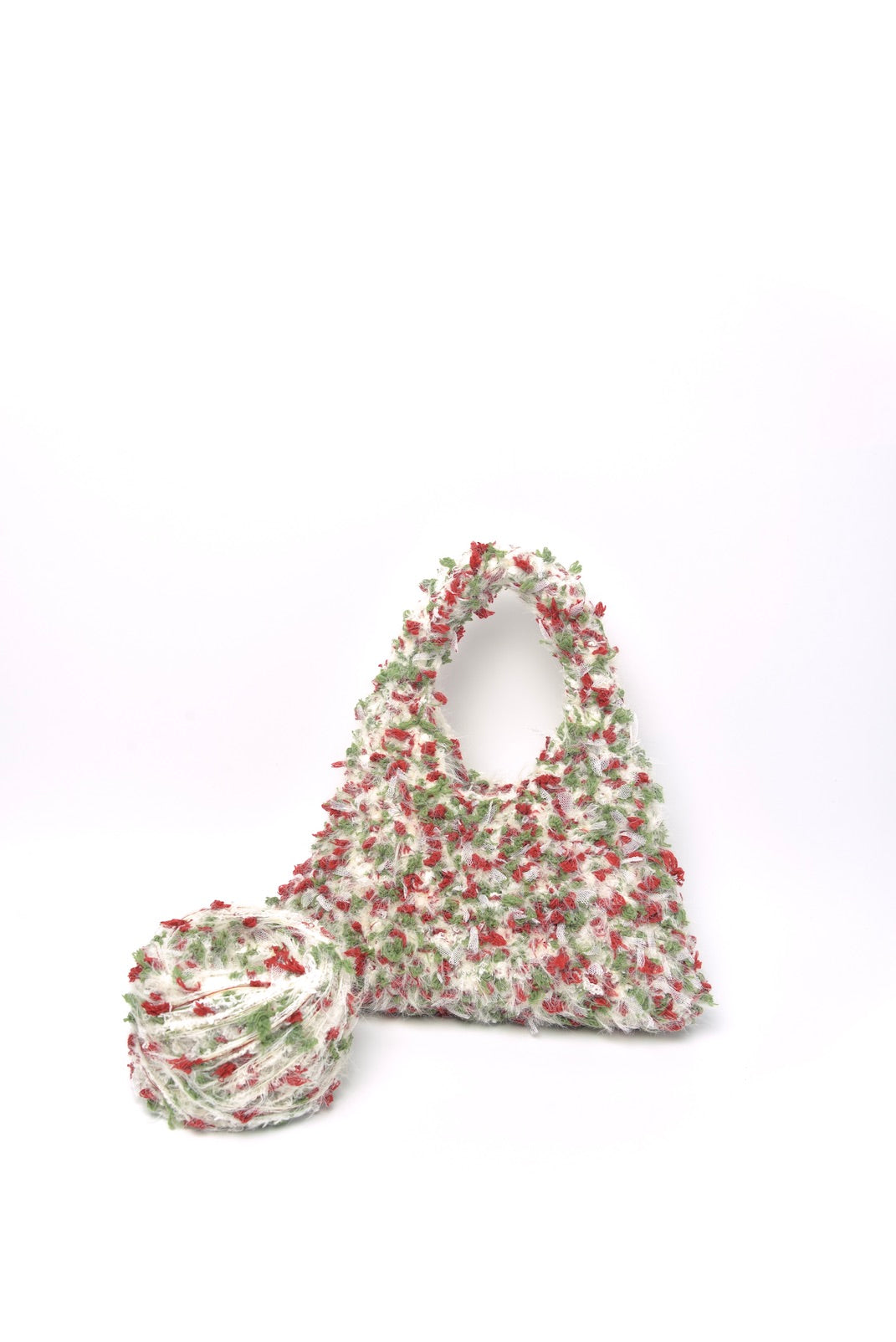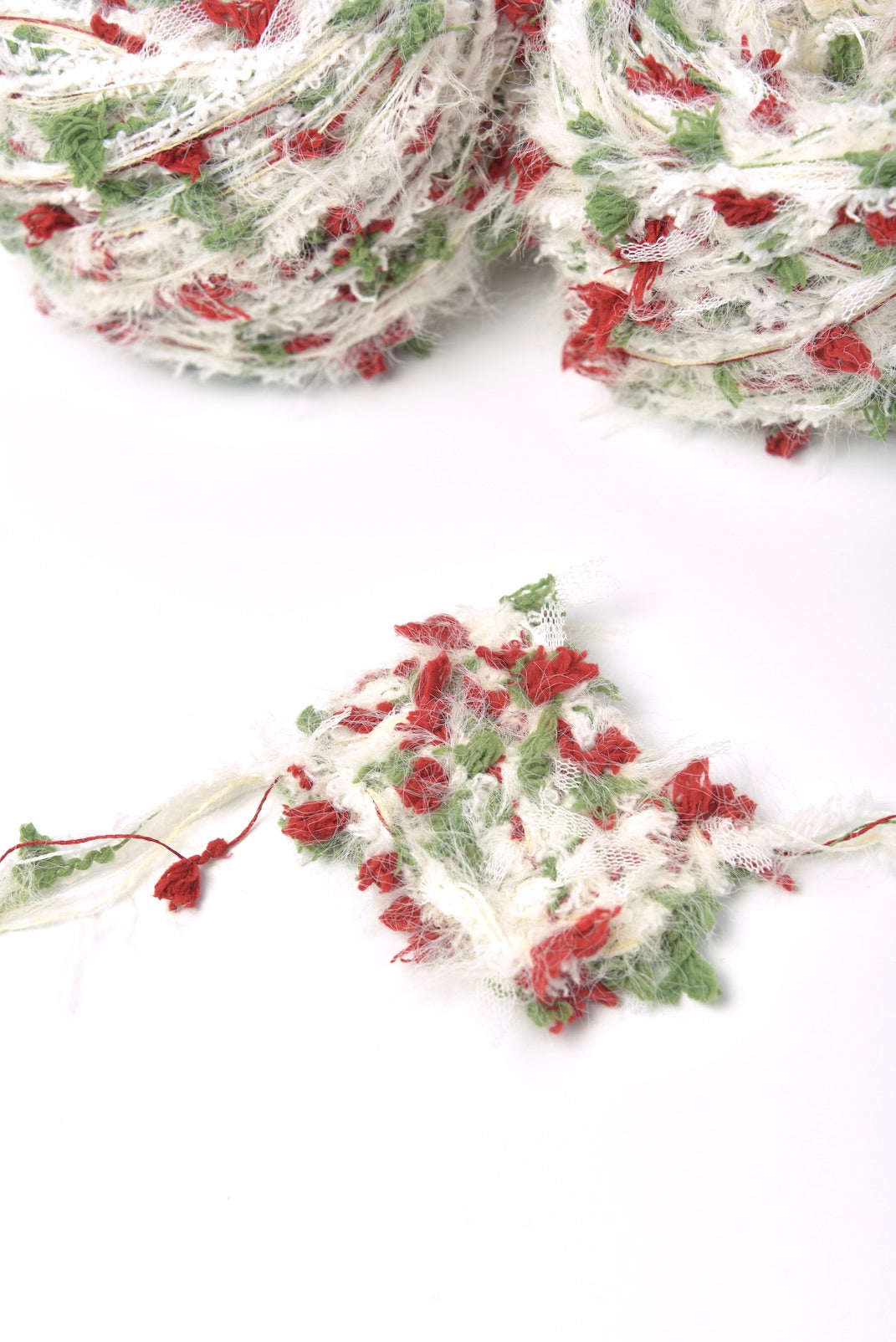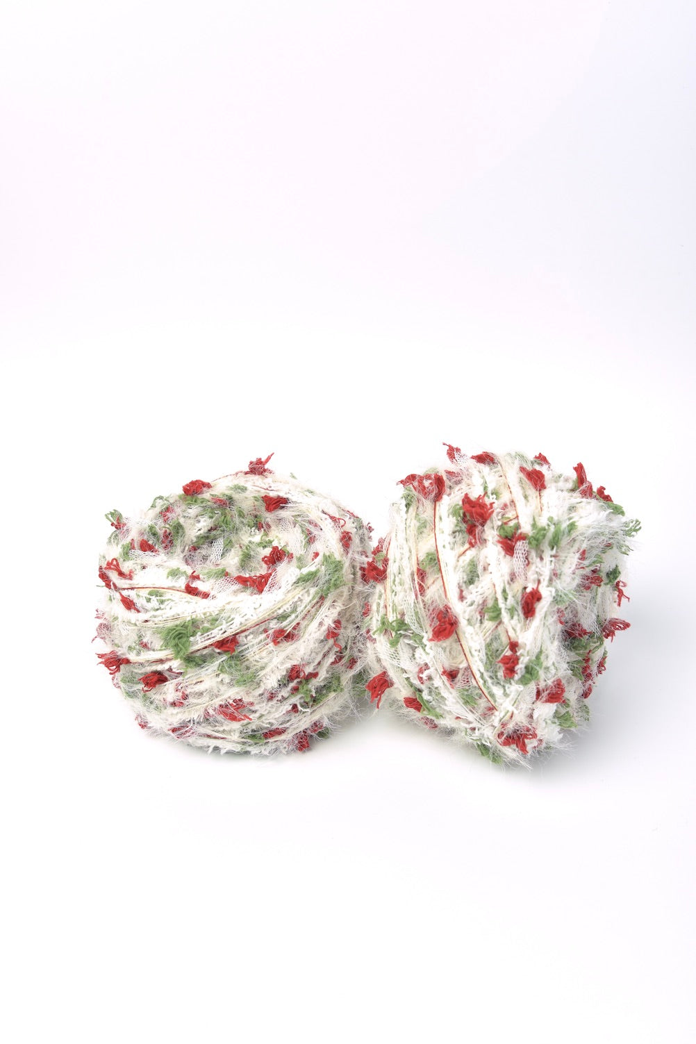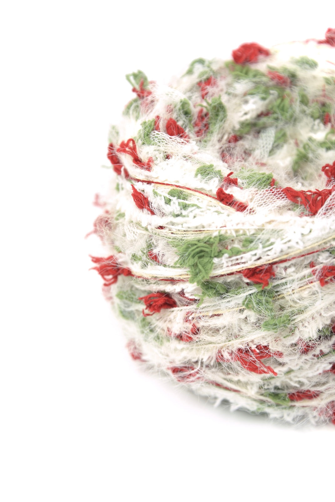 December Light Hand-mixed Yarn is a delightful blend of textures featuring soft eyelash fibers, airy ladder ribbon, and vibrant tufts of color. Inspired by a classic Christmas vibe, its creamy vanilla-white base is adorned with red and green accents that surrounded with an flowy eyelash.