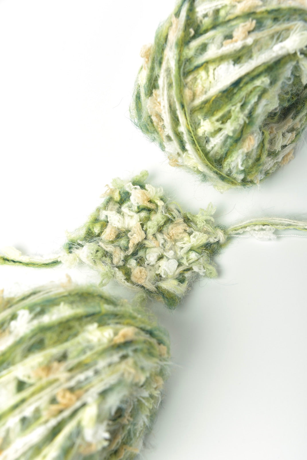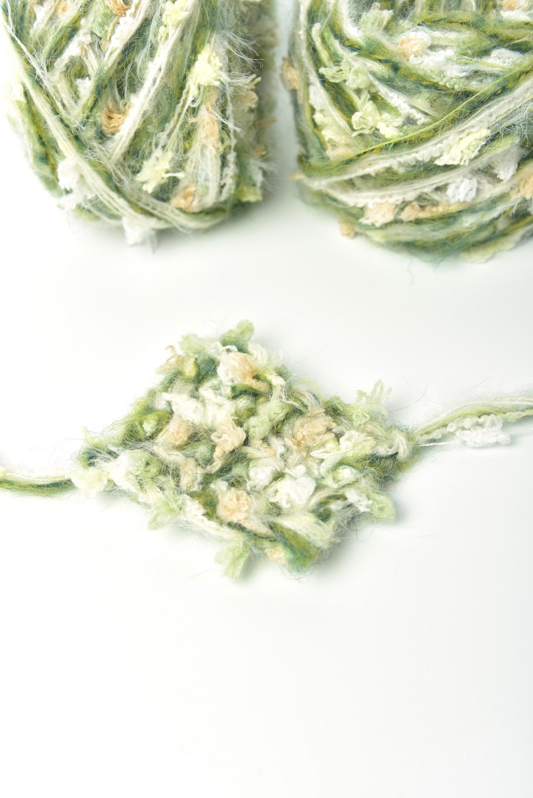 Meadow Mist Hand-mixed Yarn captures the essence of a sun-dappled meadow at dawn. This delightful texture combines a fluffy eyelash, cosy loop yarn, and vibrant tufts of colour. With a creamy base reminiscent of morning mist, it's brought to life with cheerful highlights of light yellow, peachy orange, and fresh green, all wrapped in a soft, ethereal halo.
